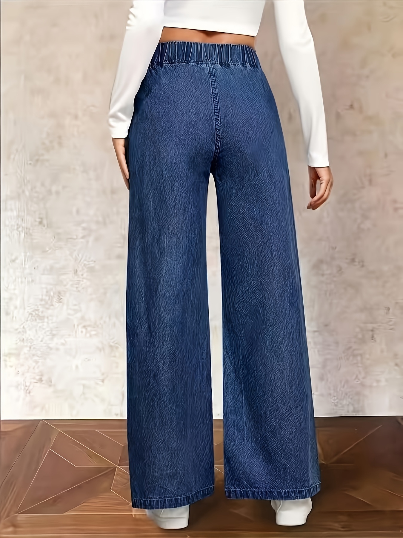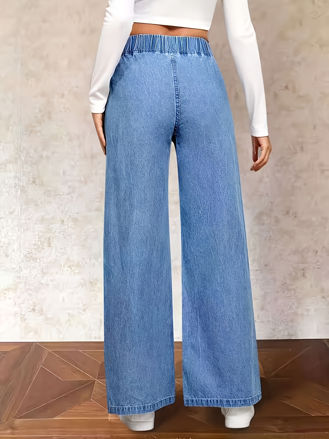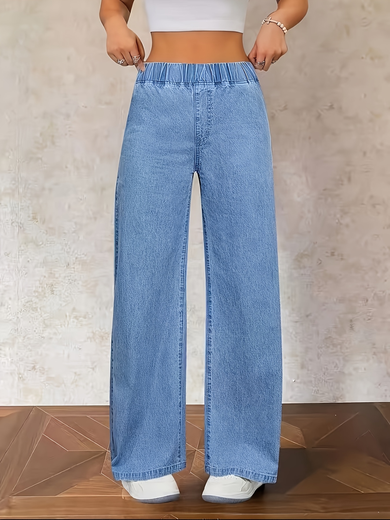Women's Washed Casual High-Waisted Elastic Waistband Blue Jeans.